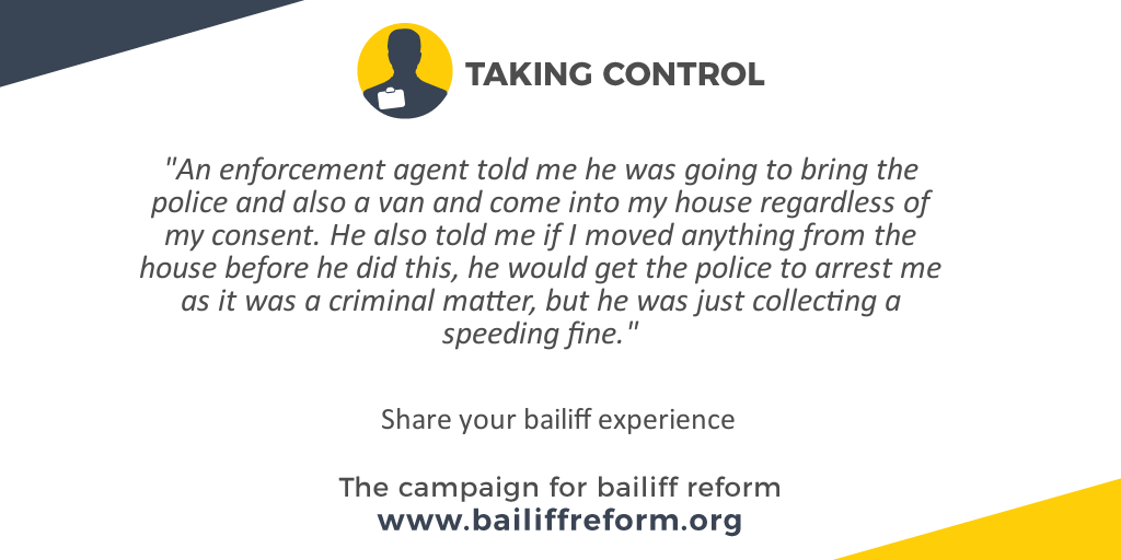The bailiff was knocking on my door, whilst I was trying to find a key to open it he kept trying the for to force his way in even though he didn’t have a warrant to do so.
